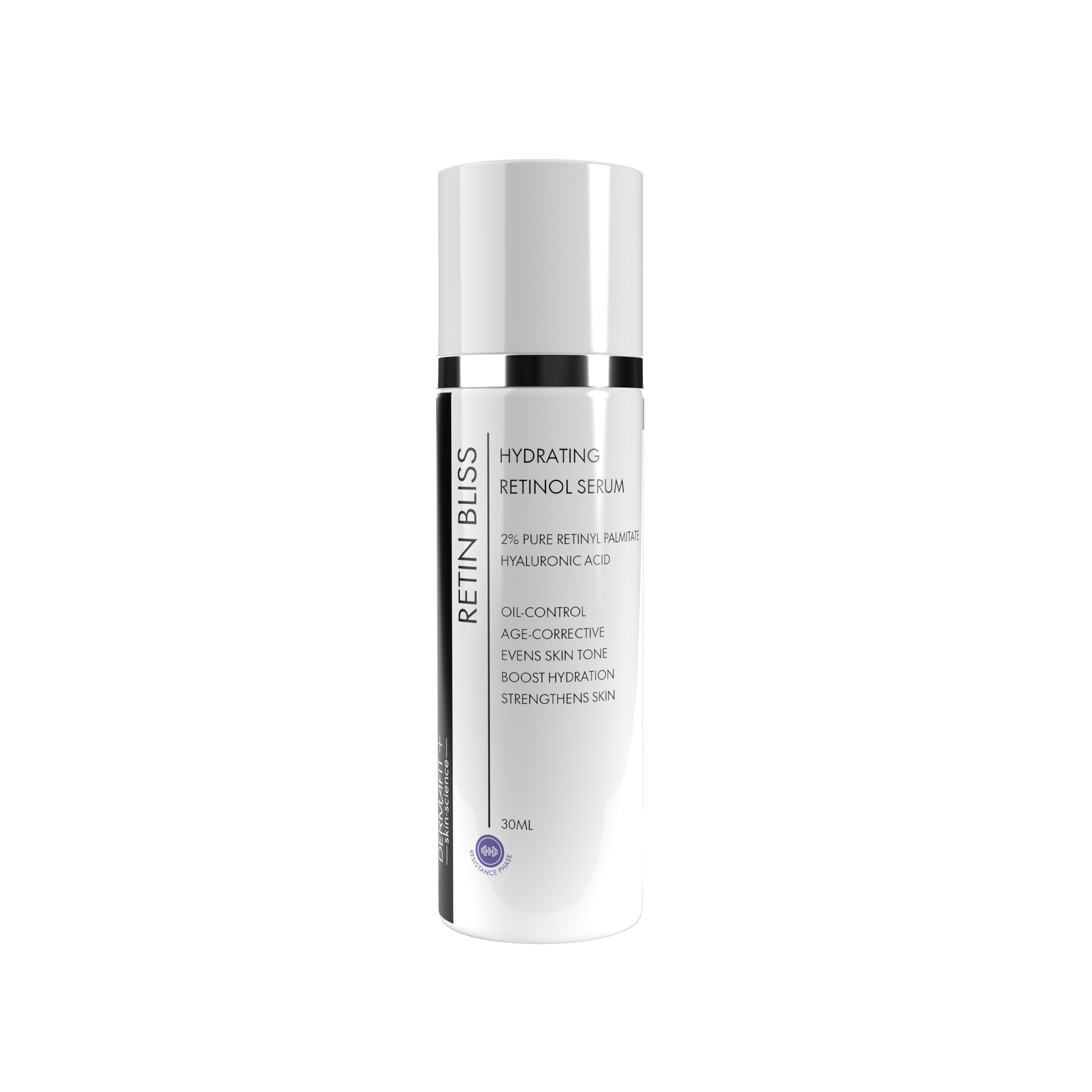 Retin Bliss is a gentle yet clinically effective retinol complex designed to deliver the regenerative benefits of Vitamin A while preserving hydration and skin comfort. Featuring 2% Retinyl Palmitate, a vitamin A ester with lower irritation potential, this serum supports cellular renewal, collagen production, and skin tone refinement—without the dryness or flaking common with stronger retinoids.